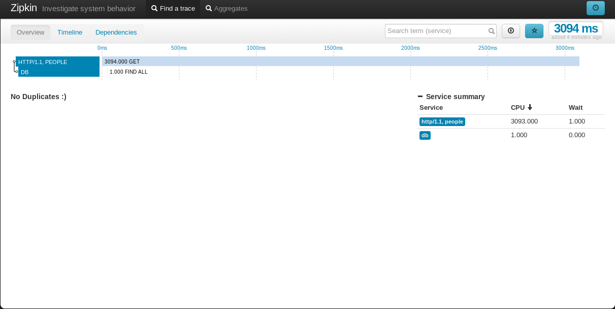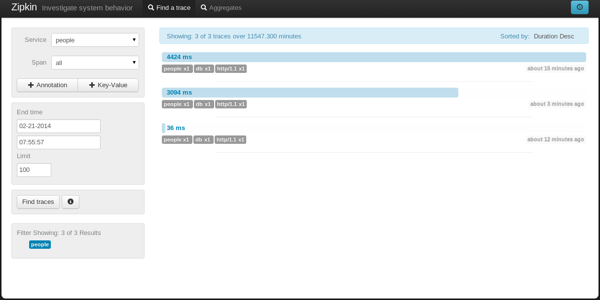 и, наконец, откройте веб-интерфейс Zipkin по адресу http: // localhost: 8080 . Мы должны увидеть что-то подобное (в зависимости от того, сколько раз вы запускали клиент):