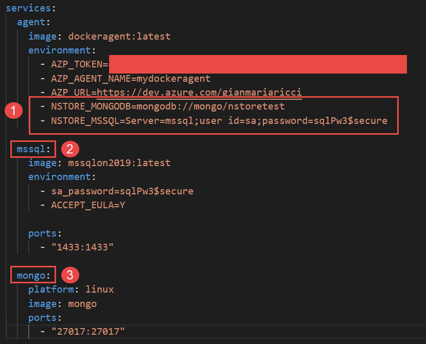 Now, I need that agent to be able to use MongoDB and MsSQL to run integration tests. Clearly, I can install both DB engines on my host machine and let the Docker agent use them, but since I’ve already used my agent in Docker, I wish for my dependencies to also run in Docker. So, welcome Docker Compose!