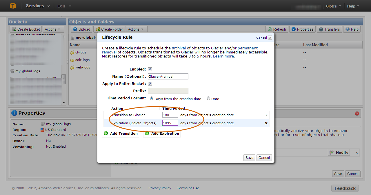 - Создайте правило «Срок действия», указав «1095» дней. Это автоматически удалит файлы журнала с S3 или Glacier через 3 года.