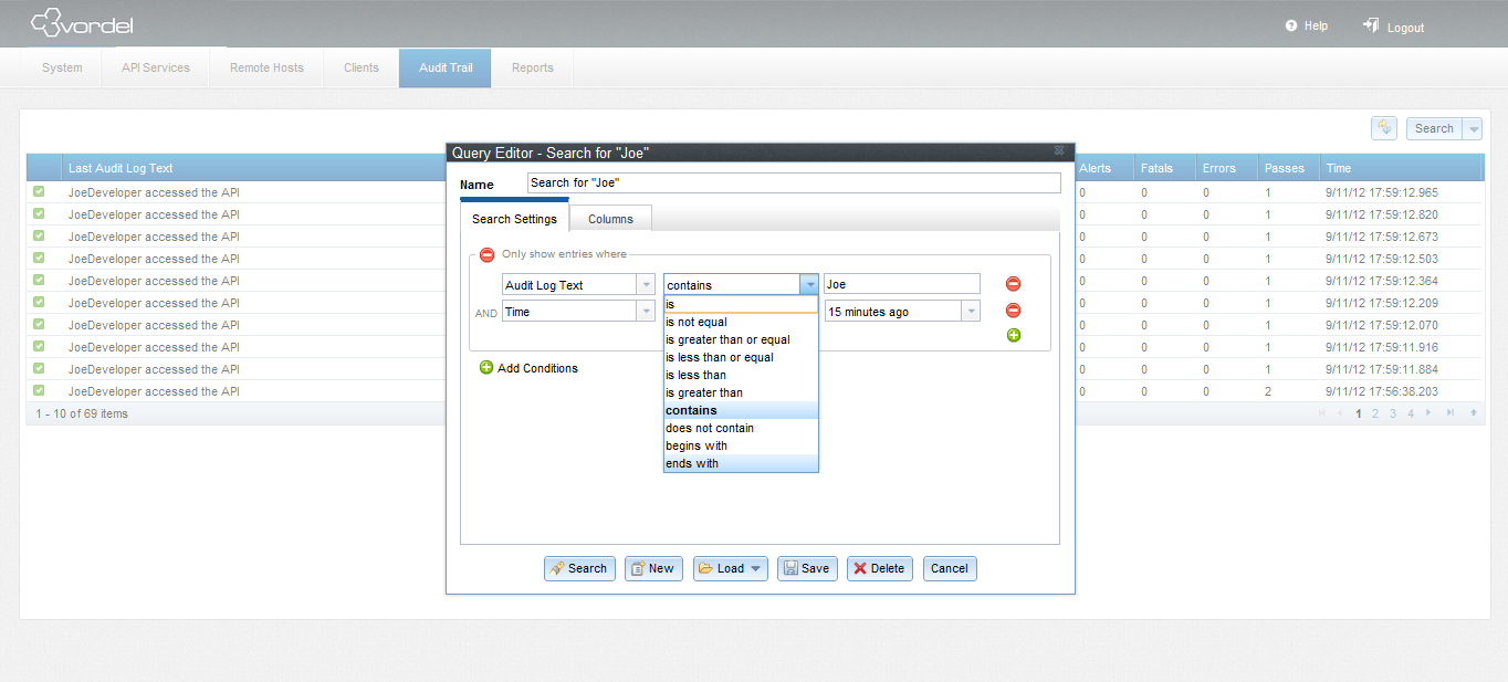 I can also search the Audit Log here. Let’s say I am only interested in the API accesses by «Joe Developer». Here in the screenshot below I construct a search looking for lines which contain «Joe»: