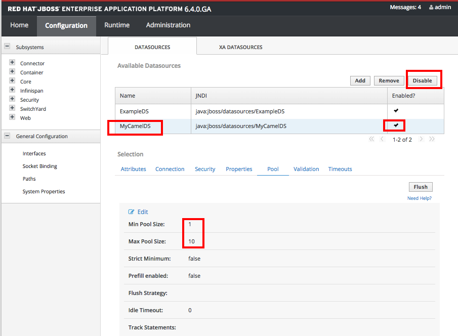Измените минимальный и максимальный размер пула на 1 и 10. Затем включите источник данных MyCamelDS.