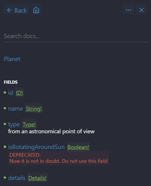 В терминах Apollo Federation Planetэто сущность - тип, на который может ссылаться другая служба (в данном случае спутниковая служба, которая определяет заглушку для Planetтипа). Объявление объекта осуществляется путем добавления @keyдирективы в определение типа. Эта директива сообщает другим службам, какие поля использовать для уникальной идентификации конкретного экземпляра типа. В @extendsаннотации объявляется, что Planetэто объект, определенный в другом месте (в данном случае в сервисе Планета). Подробнее об основных понятиях федерации Apollo см. В документации Apollo .