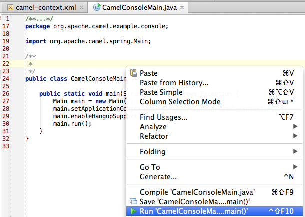 класс CamelConsoleMain . Например, как показано на скриншоте ниже от IDEA.