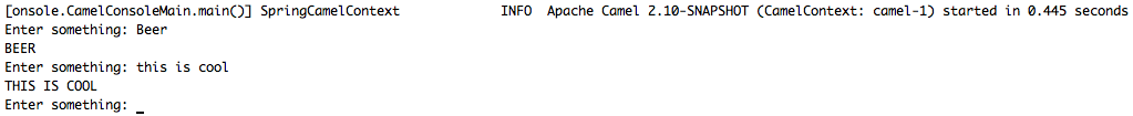 Этот пример будет предоставлен сразу после установки в Apache Camel 2.10 в каталоге examples / camel-example-console. Вы можете увидеть