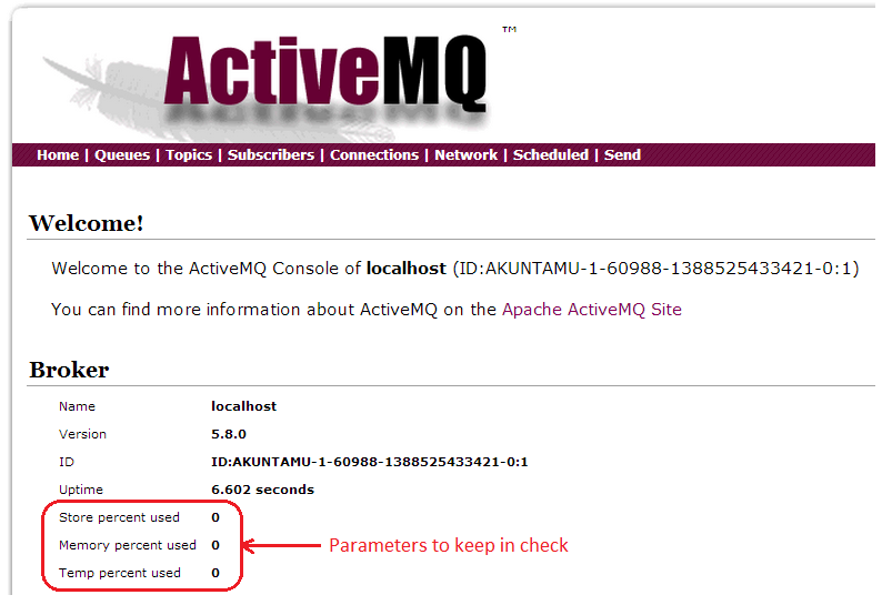 В этом блоге делается попытка разъяснить, как рассчитывается использование хранилища, температуры и памяти для одного экземпляра узла ActiveMQ-узла. Мы используем ActiveMQ версии 5.8.0 для этого объяснения.