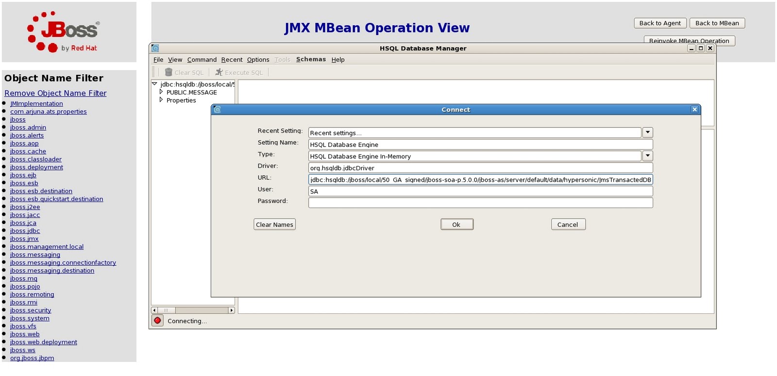 Why «headless=false?» After we run the quickstart again, the row that was written to the database should still be there. We’ll look at it with the HSQL DB Manager service. This service requires the server to not be started in its default «headless» mode, as the service opens up a Java UI application. We invoke the DB Manager from the JMX console — see screenshot — the service tag is: database=jbossesb,service=Hypersonic.