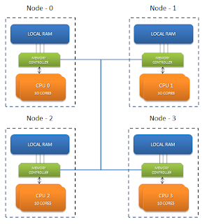 Эти блоки с огромными ядрами поставляются с архитектурой неоднородного доступа к памяти (NUMA). NUMA — это архитектура, которая повышает производительность доступа к памяти для локальных узлов. Эти новые аппаратные блоки разделены на разные зоны, называемые узлами. Эти узлы имеют определенное количество ядер с выделенной им частью памяти. Таким образом, для блока с 1 ТБ ОЗУ и 80 ядрами у нас есть 4 узла, каждый из которых имеет 20 ядер и 256 ГБ выделенной памяти.