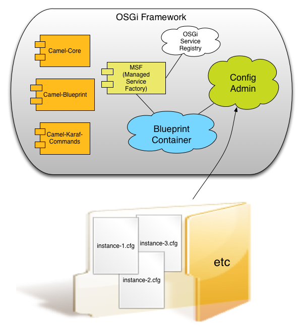 public class HelloFactory implements ManagedServiceFactory { @Override public String getName() { return configurationPid; } @Override public void updated(String pid, Dictionary dict) throws ConfigurationException { // Create a dispatching engine for given configuration. } @Override public void deleted(String pid) { // Delete corresponding dispatch engine for given configuration. } //We wire in blueprint public void init() {} public void destroy() {} public void setConfigurationPid(String configurationPid) {} public void setBundleContext(BundleContext bContext) {} public void setCamelContext(CamelContext camelContext) {} }
