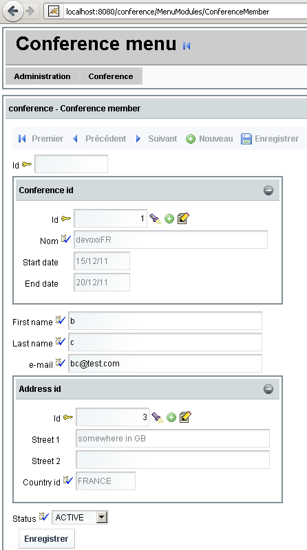 INSERT INTO conference_member (id, conference_id, first_name, last_name, email, address_id, status )