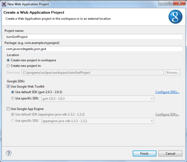 Давайте начнем с создания нового проекта Eclipse («Файл? Новый? Проект веб-приложения») и назовем его «JsonGwtProject». Выберите поддержку только для веб-инструментария Google, но не для App Engine. Роль сервера будет выполнять встроенный контейнер Jetty, предоставляемый GWT SDK.
