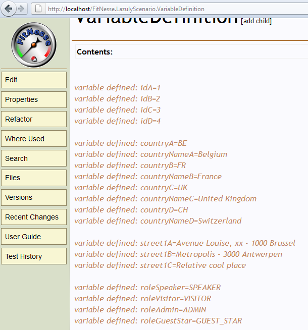 Но вы должны ссылаться на раздел «Определение переменной». Для этого используйте директиву FitNesse! Include (! Include VariableDefinition)