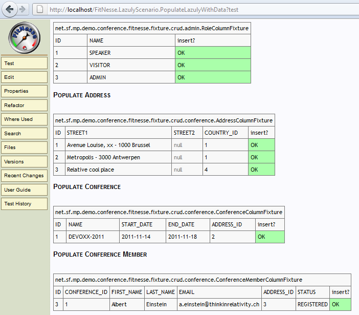 Этот пример показывает, что вы можете очень легко использовать приспособление CRUD fitnesse (требуется Zero LOC разработки), настроенное для вашей модели данных.