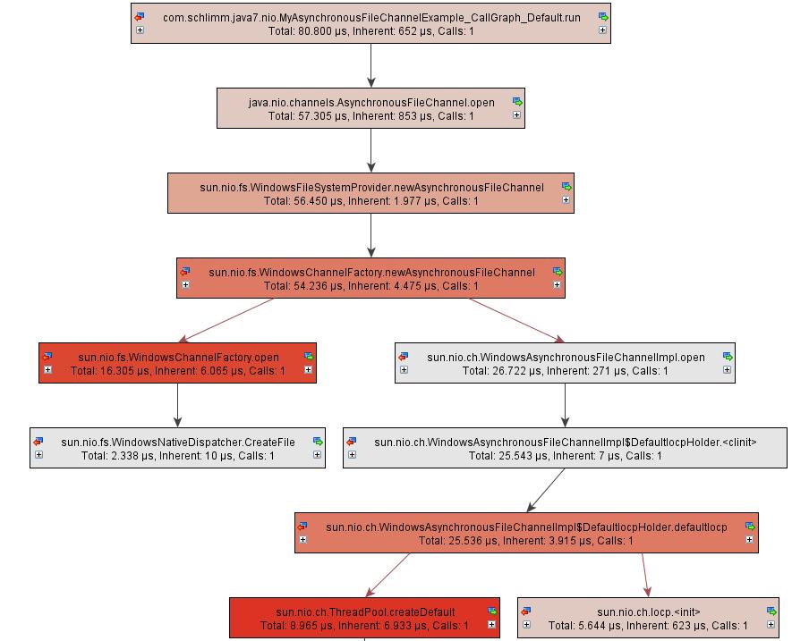 public class CallGraph_Default_AsynchronousFileChannel { private static AsynchronousFileChannel fileChannel; public static void main(String[] args) throws InterruptedException, IOException, ExecutionException { try { fileChannel = AsynchronousFileChannel.open(Paths.get("E:/temp/afile.out"), StandardOpenOption.READ, StandardOpenOption.WRITE, StandardOpenOption.CREATE, StandardOpenOption.DELETE_ON_CLOSE); Future<Integer> future = fileChannel.write(ByteBuffer.wrap("Hello".getBytes()), 0L); future.get(); } catch (Exception e) { e.printStackTrace(); } finally { fileChannel.close(); } }} |