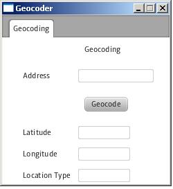 public class NewFXMain extends Application { /** * @param args the command line arguments */ public static void main(String[] args) { Application.launch(NewFXMain. class , args); } @Override public void start(Stage primaryStage) { primaryStage.setTitle( "Geocoder" ); TabPane mainTabPane = new TabPane(); Tab geoTab = new Tab( "Geocoding" ); geoTab.setClosable( false ); mainTabPane.getTabs().add(geoTab); final GridPane geoGrid = new GridPane(); geoGrid.setHgap( 10 ); geoGrid.setVgap( 10 ); geoGrid.setPadding( new Insets( 0 , 20 , 0 , 10 )); Label mainGeoLabel = new Label( "Geocoding" ); final TextBox geoAddressTextBox = new TextBox( 15 ); Button geoCodeButton = new Button( "Geocode" ); final TextBox latitudeValTextBox = new TextBox(); latitudeValTextBox.setEditable( false ); final TextBox longitudeValTextBox = new TextBox(); longitudeValTextBox.setEditable( false ); final TextBox locationTypeValTextBox = new TextBox(); locationTypeValTextBox.setEditable( false ); final StringProperty latitudeProperty = new StringProperty(); latitudeProperty.addListener( new ChangeListener<String>() { @Override public void changed(ObservableValue<? extends String> observable, String oldValue, String newValue) { latitudeValTextBox.setText(newValue); } }); final StringProperty longitudeProperty = new StringProperty(); longitudeProperty.addListener( new ChangeListener<String>() { @Override public void changed(ObservableValue<? extends String> observable, String oldValue, String newValue) { longitudeValTextBox.setText(newValue); } }); final StringProperty locationTypeProperty = new StringProperty(); locationTypeProperty.addListener( new ChangeListener<String>() { @Override public void changed(ObservableValue<? extends String> observable, String oldValue, String newValue) { locationTypeValTextBox.setText(newValue); } }); geoCodeButton.setOnAction( new EventHandler<ActionEvent>(){ @Override public void handle(ActionEvent event) { String address = geoAddressTextBox.getText(); if (address == null ){ } else { Geocode parsedCode = (Geocode)GeocodingParser.getGeocodeForAddress(address); latitudeProperty.set(parsedCode.getLatitude()); longitudeProperty.set(parsedCode.getLongitude()); locationTypeProperty.set(parsedCode.getLocationType()); } } }); geoGrid.add(mainGeoLabel, 4 , 1 ); geoGrid.add( new Label( "Address" ), 2 , 3 ); geoGrid.add(geoAddressTextBox, 3 , 3 , 3 , 1 ); geoGrid.add( new Label( "Latitude" ), 2 , 7 ); geoGrid.add( new Label( "Longitude" ), 2 , 8 ); geoGrid.add( new Label( "Location Type" ), 2 , 9 ); geoGrid.add(latitudeValTextBox, 3 , 7 , 2 , 1 ); geoGrid.add(longitudeValTextBox, 3 , 8 , 2 , 1 ); geoGrid.add(locationTypeValTextBox, 3 , 9 , 2 , 1 ); geoGrid.add(geoCodeButton, 4 , 5 ); geoTab.setContent(geoGrid); Scene scene = new Scene(mainTabPane); primaryStage.setScene(scene); primaryStage.setVisible( true ); primaryStage.setResizable( false ); } } |