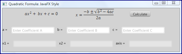 Приведенный выше код JavaFX 2 загружает два изображения с прозрачным фоном для отображения стандартной формы квадратного уравнения и отображения квадратной формулы. В предыдущем посте я загружал эти изображения с внешнего URL-адреса, но в этом примере я загружал их из JAR-файла приложения. Эти изображения отображаются рядом независимо от приложения.