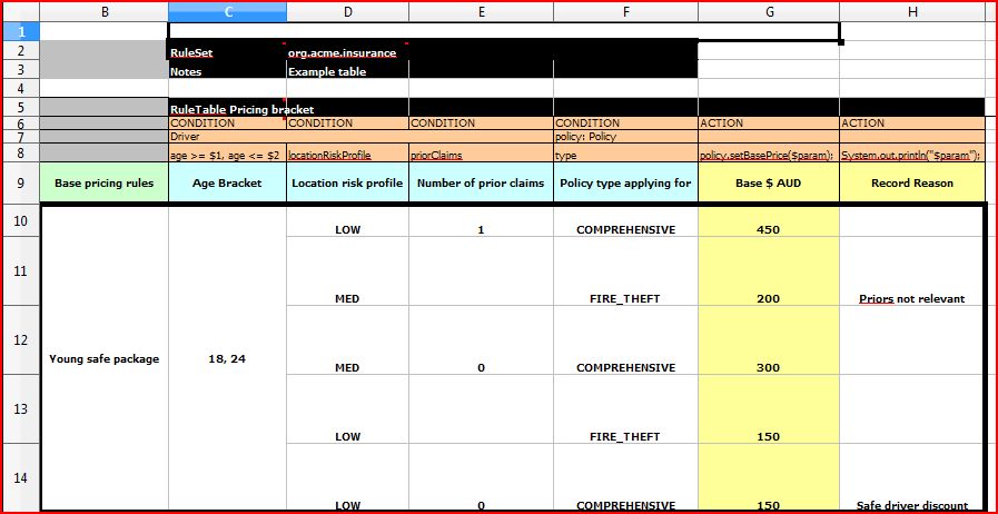 Деловые люди, предъявляющие нам наши требования, понимают электронные таблицы, некоторые из них лучше, чем мы, разработчики, и это самый большой бонус на таблицах решений. Таблица решений Drools на первый взгляд выглядела так, как будто ее было бы не так просто передать бизнес-пользователям, как таблица Quickrules, но на самом деле она довольно четко разделена на «код» и «данные».