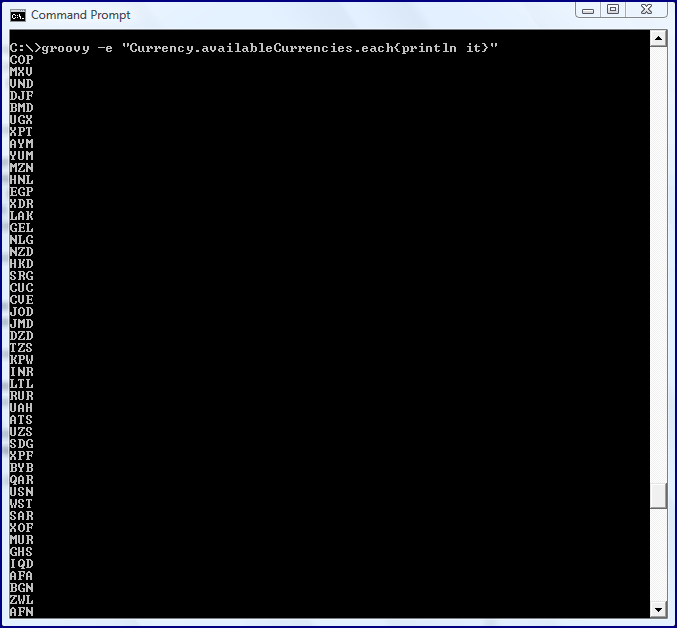 groovy -e «Currency.availableCurrencies.each {println it}»