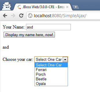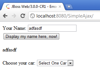 <!DOCTYPE html PUBLIC '-//W3C//DTD XHTML 1.0 Transitional//EN' 'http://www.w3.org/TR/xhtml1/DTD/xhtml1-transitional.dtd'><html xmlns='http://www.w3.org/1999/xhtml' xmlns:ui='http://java.sun.com/jsf/facelets' xmlns:h='http://java.sun.com/jsf/html'<h:head></h:head><h:body> <h:form> <h:messages id='myMessage' globalOnly='true' showDetail='true' /> Your Name: <h:inputText id='inputname' label='${msgs.prompt}' value='#{user.name}' /> <br /> <h:commandButton action='#{user.sayHello}' value='Display my name here, now!'> <f:ajax render='myName myCars myMessage' execute='inputname' listener='#{user.editMyCarsList}' /> </h:commandButton> <br /> <br /> <h:outputText id='myName' value='#{user.name}' /> <br /> <br /> Choose your car: <h:selectOneMenu id='myCars' binding='#{user.htmlSelectCars}' value='#{user.selectedCar}' /> <br /> <br /> </h:form></h:body></html> |