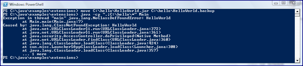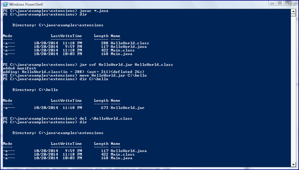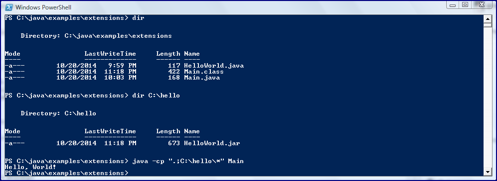 Чтобы продемонстрировать основное различие между classpath и механизмом расширения ( необязательные пакеты ), я заархивирую скомпилированный HelloWorld.class