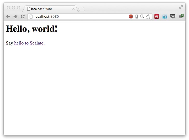 Каждый раз, когда мы сохраняем файл в Eclipse, sbt будет копировать и перекомпилировать ресурсы. Таким образом, мы можем напрямую видеть наши измененные файлы в браузере. Откройте файл HelloScalatraServlet и измените текст приветствия. Если вы сохраните это, sbt перезагрузит приложение и вы сразу увидите измененные файлы.