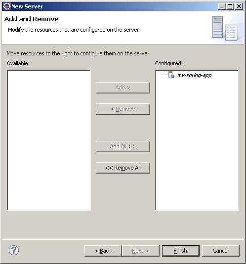 - На следующей странице выберите my-spring-app и нажмите «Добавить», чтобы настроить Eclipse на использование нового Сервера в качестве контейнера времени выполнения. Выберите «Финский».