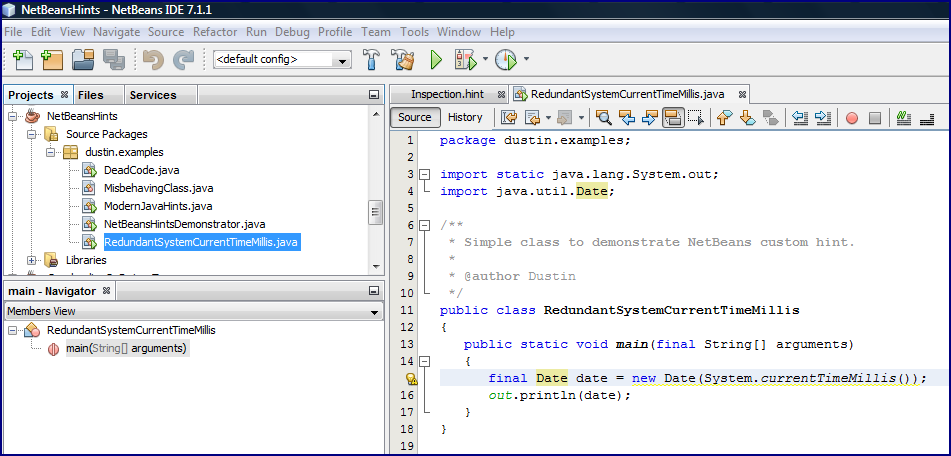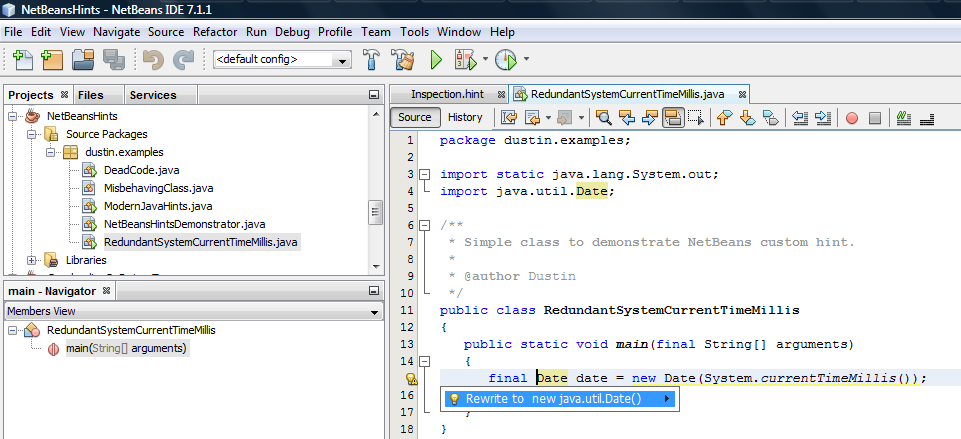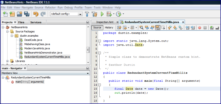 . Я писал ранее, что подсказки NetBeans настолько удобны, потому что на самом деле они делают три вещи для разработчика Java: автоматически отмечают области для улучшения кода для разработчика, часто автоматически исправляют проблему, если это необходимо, и сообщают о лучших способах написания Java , Для последнего преимущества в этом случае, наличие этой пользовательской подсказки помогает донести до других разработчиков Java немного больше знаний о классе Date
