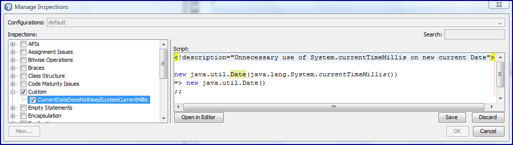 Когда я нажимаю «Управление» и отмечаю поле «Пользовательский», оно расширяется, и я вижу только что созданную подсказку «Проверка». Если я нажму на это имя, я могу переименовать его и сделать это в этом случае. Переименованная проверка («CurrentDateDoesNotNeedSystemCurrentMillis») показана на следующем снимке экрана.