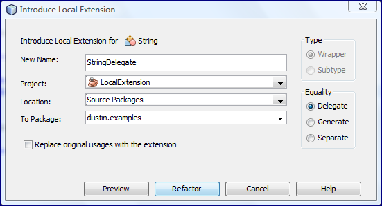 Я был приятно удивлен, увидев, что NetBeans 7.2 не допускает опцию «Подтип» в этом случае (строка является окончательной и не может быть расширена). Я должен использовать «Обертку», но могу выбрать один из трех вариантов «Равенство» для «Обертки». В этом примере я не буду вдаваться в подробности со String, но мастер сгенерирует локальные расширения как оболочки, используя любую из трех опций «Равенство». Во всех случаях определенные методы в сгенерированном классе должны быть удалены или изменены для компиляции нового кода. Снимок экрана использования этого с String с использованием «Wrapper» и «Delegate» показан далее.