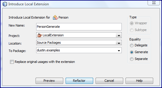 При использовании локального расширения типа «Обертка» возможны три варианта «Равенство». Следующие три снимка экрана показывают использование каждого с классом, соответствующим образом названным для каждого. Обратите внимание, что я снял флажок, чтобы поменять свое использование Person на этот новый класс, потому что я хотел использовать этот исходный класс Person для демонстрации рефакторинга для параметров равенства «Создать» и «Отдельно» в дополнение к «Делегировать».