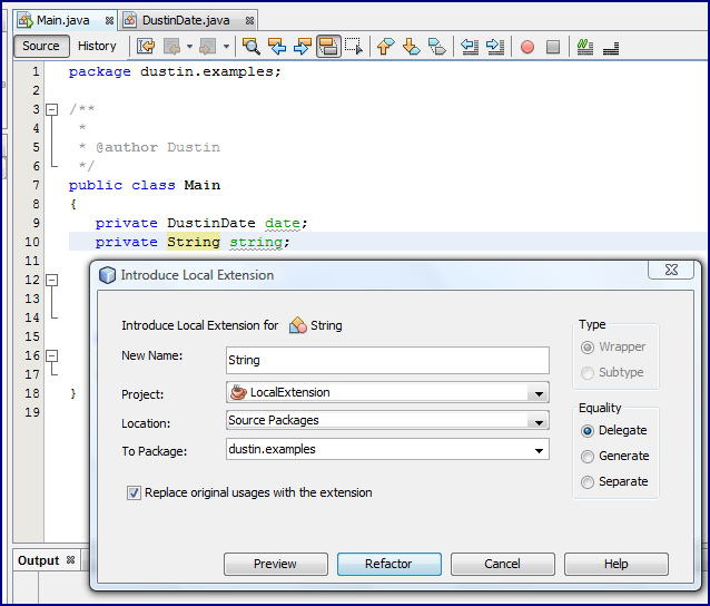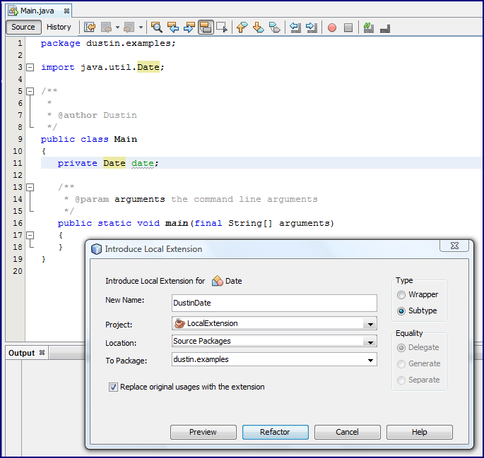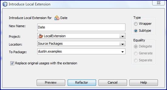 Также стоит отметить, что есть флажок, который позволяет мне указать, хочу ли я заменить исходный класс (в данном случае, Дата) с измененным локальным расширением. Другими словами, я могу заставить рефакторинг не только создать локальное расширение подтипа, но и заставить NetBeans заменить использование Date в исходном коде Main на новый класс. Это показано на следующем снимке экрана.