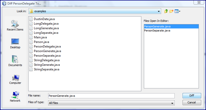 I’m then presented with the option of the file to diff PersonDelegate to in either the same package (or browser allows arbitrary location to be specified) or opened in the editor window. In this case, I have selected PersonGenerate in the right side choices of files already open in the editor.