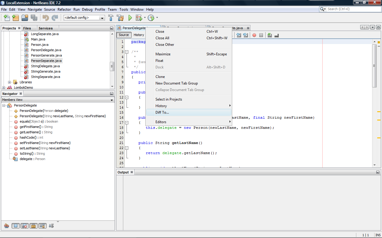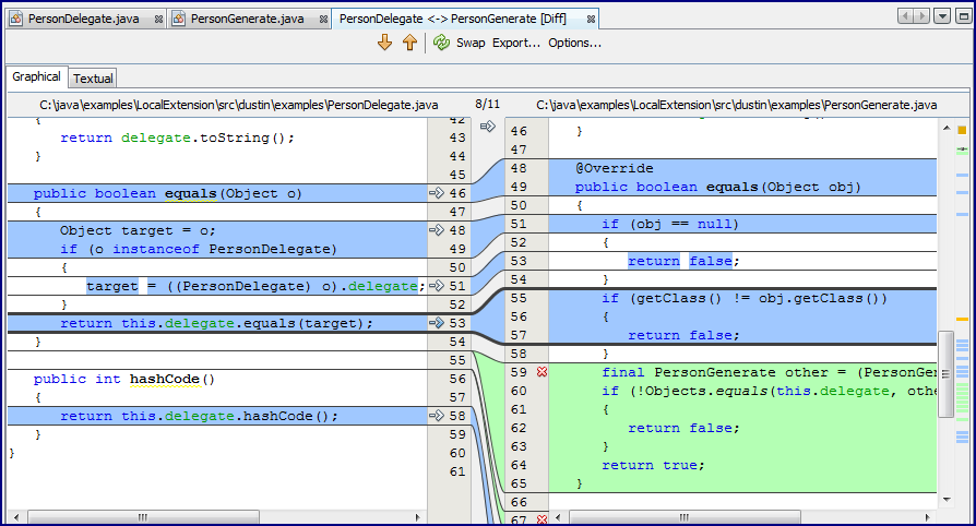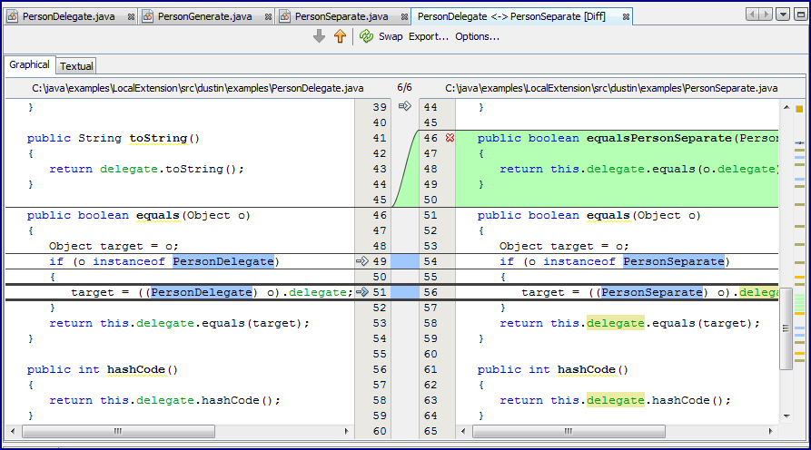 NetBeans displays the differences between PersonDelegate and PersonGenerate as shown in the next screen snapshot.