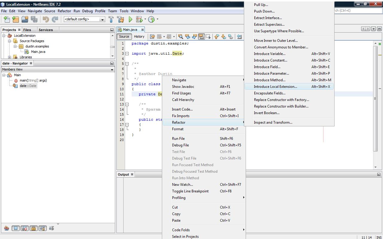 Одним из новых рефакторингов, доступных в NetBeans 7.2, является «Введение локального расширения», к которому можно легко получить доступ, щелкнув правой кнопкой мыши класс, для которого требуется предоставить локальное расширение, выбрав опцию «Refactor», чтобы развернуть раскрывающийся список. меню и выбрав «Ввести локальное расширение». В качестве альтернативы, можно просто выделить класс интереса и использовать клавиатуру: Alt + Shift + X . Первый (с использованием раскрывающихся меню в сочетании с правым и левым щелчками мыши) показан на следующем снимке экрана после наведения курсора на использование класса Java Date в исходном коде (который указан после снимка экрана).