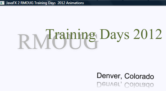 Я решил запустить простой анимированный образец JavaFX 2, когда посетители вошли в комнату для моей презентации RMOUG Training Days 2012 . Желаемый результат был достигнут, когда участники спросили, было ли реализовано работающее приложение. Несколько человек были удивлены тем, что это было реализовано в «чистой Java» без Flash или HTML5. Я предоставляю исходный код для этого простого примера вместе с некоторыми снимками экрана в этом посте. Попутно этот пример демонстрирует анимацию нескольких экземпляров Text вдоль пути одновременно.