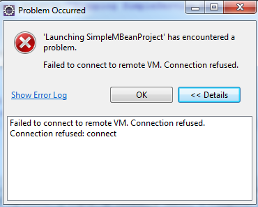 После этого запустите сервер нормально. Настало время подключиться к серверу через Eclipse. Перейти к «Бежать? Отладка конфигураций… », а затем дважды щелкните параметр« Удаленное приложение Java ». На вкладке «Подключение» убедитесь, что выбран «SimpleMBeanProject», укажите IP-адрес или имя хоста «хоста» (в моем случае «localhost») и «Порт», который сервер прослушивает для входящих сеансов отладки (8787 как настроено ранее). Наконец, убедитесь, что «Разрешить завершение удаленной виртуальной машины» НЕ выбрано, потому что если это так, JVM сервера отключится, как только вы отключите отладку. Не очень хорошая вещь, чтобы случиться с производственным сервером. Хорошо, нажмите кнопку «Отладка», чтобы продолжить.