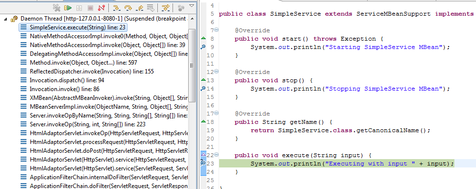 Снова запустите удаленную отладку, и теперь вы уверены, что выполнение будет приостановлено, если вы предоставите свой собственный ввод. Чтобы продемонстрировать это, вернитесь к консоли JMX и представлению MBean «SimpleService». В методе execute используйте случайный аргумент: