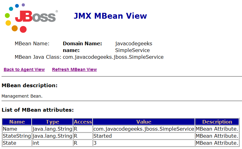 Прокрутите вниз, пока не найдете запись «name = SimpleService» и перейдите по ссылке. Атрибуты Mbean вместе со списком операций появятся там.