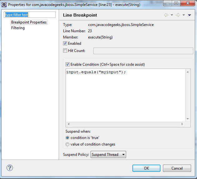 Появится меню свойств. Установите флажок «Enable Condition» и в текстовой области введите условие. Точка останова будет действительной и приостановит выполнение только тогда, когда это условие выполнено. Обратите внимание, что вы на самом деле пишете Java-код внутри текстовой области и что вы можете использовать для этого знакомую помощь по коду (используя Ctrl + Space). Разве Eclipse не невероятный инструмент? Мы хотим, чтобы точка останова включалась только тогда, когда аргумент метода — «myinput».