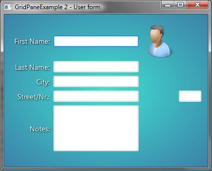 private GridPane createGrid() { GridPane gridPane = new GridPane(); gridPane.setPadding( new Insets( 20 , 0 , 20 , 20 )); gridPane.setHgap( 7 ); gridPane.setVgap( 7 ); Label lbFirstName = new Label( 'First Name:' ); lbFirstName.setStyle(LABEL_STYLE); GridPane.setConstraints(lbFirstName, 0 , 0 , 1 , 1 , HPos.RIGHT, VPos.CENTER); TextField tfFirstName = new TextField(); GridPane.setConstraints(tfFirstName, 1 , 0 ); Label lbLastName = new Label( 'Last Name:' ); lbLastName.setStyle(LABEL_STYLE); GridPane.setConstraints(lbLastName, 0 , 1 , 1 , 1 , HPos.RIGHT, VPos.CENTER); TextField tfLastName = new TextField(); GridPane.setConstraints(tfLastName, 1 , 1 ); Label lbCity = new Label( 'City:' ); lbCity.setStyle(LABEL_STYLE); GridPane.setConstraints(lbCity, 0 , 2 , 1 , 1 , HPos.RIGHT, VPos.CENTER); TextField tfCity = new TextField(); GridPane.setConstraints(tfCity, 1 , 2 ); Label lbStreetNr = new Label( 'Street/Nr.:' ); lbStreetNr.setStyle(LABEL_STYLE); GridPane.setConstraints(lbStreetNr, 0 , 3 , 1 , 1 , HPos.RIGHT, VPos.CENTER); TextField tfStreet = new TextField(); tfStreet.setPrefColumnCount( 14 ); GridPane.setConstraints(tfStreet, 1 , 3 , 2 , 1 ); TextField tfNumber = new TextField(); tfNumber.setPrefColumnCount( 3 ); GridPane.setConstraints(tfNumber, 3 , 3 ); Label lbNotes = new Label( 'Notes:' ); lbNotes.setStyle(LABEL_STYLE); GridPane.setConstraints(lbNotes, 0 , 4 , 1 , 1 , HPos.RIGHT, VPos.CENTER); TextArea taNotes = new TextArea(); taNotes.setPrefColumnCount( 5 ); taNotes.setPrefRowCount( 5 ); GridPane.setConstraints(taNotes, 1 , 4 , 3 , 2 ); ImageView imageView = new ImageView( new Image(getClass() .getResourceAsStream( 'person.png' ), 0 , 65 , true , true )); GridPane.setConstraints(imageView, 2 , 0 , 3 , 3 , HPos.LEFT, VPos.CENTER); gridPane.getChildren().addAll(lbFirstName, tfFirstName, imageView , lbLastName, tfLastName, lbCity, tfCity, lbStreetNr, tfStreet , tfNumber, lbNotes, taNotes); return gridPane; } |