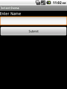 using System; using Android.App; using Android.Content; using Android.Widget; using Android.OS; namespace IntentDemo { [Activity(Label = "IntentDemo", MainLauncher = true, Icon = "@drawable/icon")] public class Activity1 : Activity { EditText txt_Name; Button btn_Submit; protected override void OnCreate(Bundle bundle) { base.OnCreate(bundle); // Set our view from the "main" layout resource SetContentView(Resource.Layout.Main); //Get txt_Name and btn_Submit Button CheckBox control from the Main.xaml Layout. txt_Name = FindViewById<EditText>(Resource.Id.txt_Name); btn_Submit = FindViewById<Button>(Resource.Id.btn_Submit); //btn_Submit click event btn_Submit.Click += btn_Submit_Click; } void btn_Submit_Click(object sender, EventArgs e) { //if EditText in not Empty if(txt_Name.Text!="") { //passing the Activity2 in Intent Intent i = new Intent(this,typeof(Activity2)); //Add PutExtra method data to intent. i.PutExtra("Name",txt_Name.Text.ToString()); //StartActivity StartActivity(i); } else { Toast.MakeText(this,"Please Provide Name",ToastLength.Short).Show(); } } } }