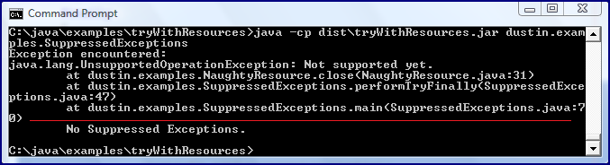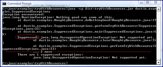 Другая перспектива для рассмотрения исключенных исключений — это трассировка полного стека. Следующие три изображения представляют собой снимки экрана с трассировками полного стека, полученными в результате использования try-with-resources (явно показывает подавленное исключение), использования традиционного оператора try-finally без явного добавления подавленных исключений (и, следовательно, никаких исключенных исключений в трассировке полного стека) и использование традиционного try-finally с явно добавленными подавленными исключениями (и, таким образом, они появляются в полной трассировке стека). Я добавил красную линию к каждому изображению, чтобы отдельно показать, где заканчивается трассировка полного стека, и обвел явную ссылку на подавленное исключение, где это применимо.