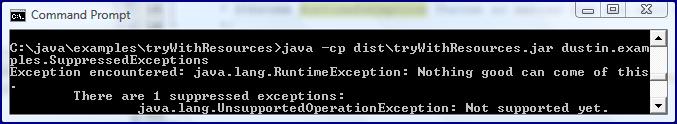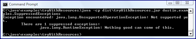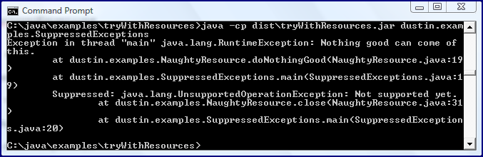 Вывод измененного класса показан далее. Обратите внимание, что исключение, возникающее в результате использования самого ресурса, теперь связано с брошенным исключением как подавленным исключением . Хотя здесь и не показано, Throwable также теперь предоставляет конструктор, который позволяет посредством логического аргумента указывать, разрешены ли (исключены) ли запрещенные исключения для вновь созданного экземпляра Throwable.