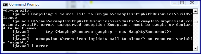 package dustin.examples;/** * Demonstrate JDK 7's Suppressed Exceptions API support. * * @author Dustin */public class SuppressedExceptions{ /** * Executable function demonstrating suppressed exceptions. * * @param arguments The command line arguments; none expected. */ public static void main(String[] arguments) throws Exception { try (NaughtyResource naughty = new NaughtyResource()) { naughty.doNothingGood(); } }} |