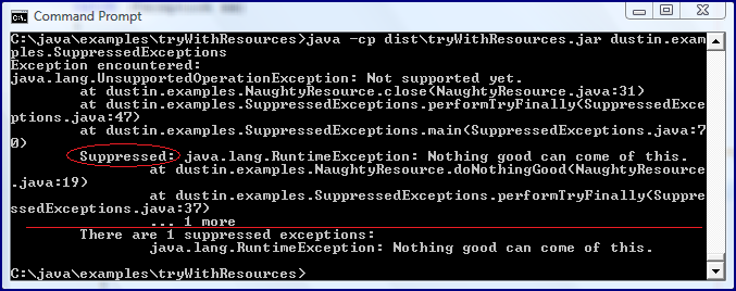 package dustin.examples;import static java.lang.System.err;/** * Demonstrate JDK 7's Suppressed Exceptions API support. * * @author Dustin */public class SuppressedExceptions{ /** * Method that uses NaughtyResource with try-with-resource statement. * * @throws Exception Expected exception for try-with-resource used on the * NaughtyResource. */ public static void performTryWithResource() throws Exception { try (NaughtyResource naughty = new NaughtyResource()) { naughty.doNothingGood(); } } /** * Executable function demonstrating suppressed exceptions. * * @param arguments The command line arguments; none expected. */ public static void main(String[] arguments) { try { performTryWithResource(); } catch (Exception ex) { err.println("Exception encountered: " + ex.toString()); final Throwable[] suppressedExceptions = ex.getSuppressed(); final int numSuppressed = suppressedExceptions.length; if (numSuppressed > 0) { err.println("\tThere are " + numSuppressed + " suppressed exceptions:"); for (final Throwable exception : suppressedExceptions) { err.println("\t\t" + exception.toString()); } } } }} |