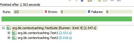 Если я сейчас запускаю небольшой набор тестов с двумя тестами, каждый из которых использует один и тот же контекст приложения, то поведение таково, что первый тест проходит около 2 секунд, но второй тест выполняется быстро из-за кэширования контекста.