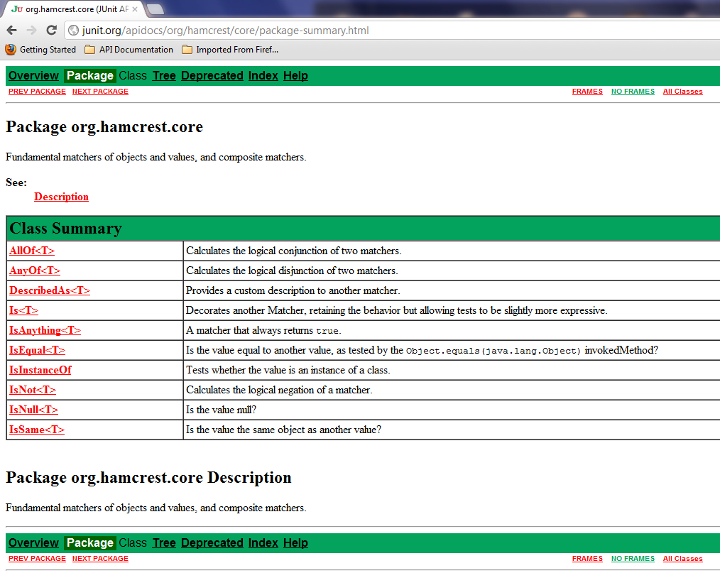 Двумя преимуществами JUnit, включая встроенные в ядро средства сравнения Hamcrest, является то, что нет необходимости специально загружать Hamcrest и нет необходимости явно включать его в пути классов модульных тестов. Прежде чем взглянуть на более удобные «основные» средства сравнения Hamcrest, важно отметить, что я намеренно и неоднократно имею в виду «основные» средства сравнения Hamcrest, потому что последние версии JUnit предоставляют только «основные» (и не все ) средства сравнения Hamcrest. автоматически. Любые сопоставители Hamcrest вне основных сопоставителей по-прежнему необходимо загружать отдельно и явно указывать в пути к классам модульных тестов. Один из способов получить представление о том, что является «ядром» Hamcrest (и, следовательно, какие средства сопоставления доступны по умолчанию в последних версиях JUnit), состоит в том, чтобы взглянуть на документацию API этого Javadoc-пакета :