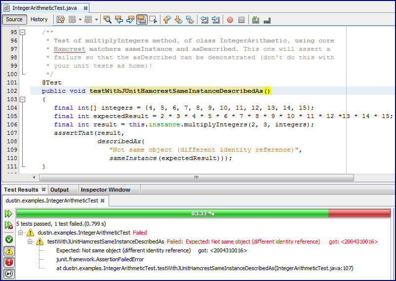 /** * Test of multiplyIntegers method, of class IntegerArithmetic, using core * Hamcrest matchers sameInstance and asDescribed. This one will assert a * failure so that the asDescribed can be demonstrated (don't do this with * your unit tests as home)! */ @Test public void testWithJUnitHamcrestSameInstanceDescribedAs() { final int [] integers = { 4 , 5 , 6 , 7 , 8 , 9 , 10 , 11 , 12 , 13 , 14 , 15 }; final int expectedResult = 2 * 3 * 4 * 5 * 6 * 7 * 8 * 9 * 10 * 11 * 12 * 13 * 14 * 15 ; final int result = this .instance.multiplyIntegers( 2 , 3 , integers); assertThat(result, describedAs( "Not same object (different identity reference)" , sameInstance(expectedResult))); } |