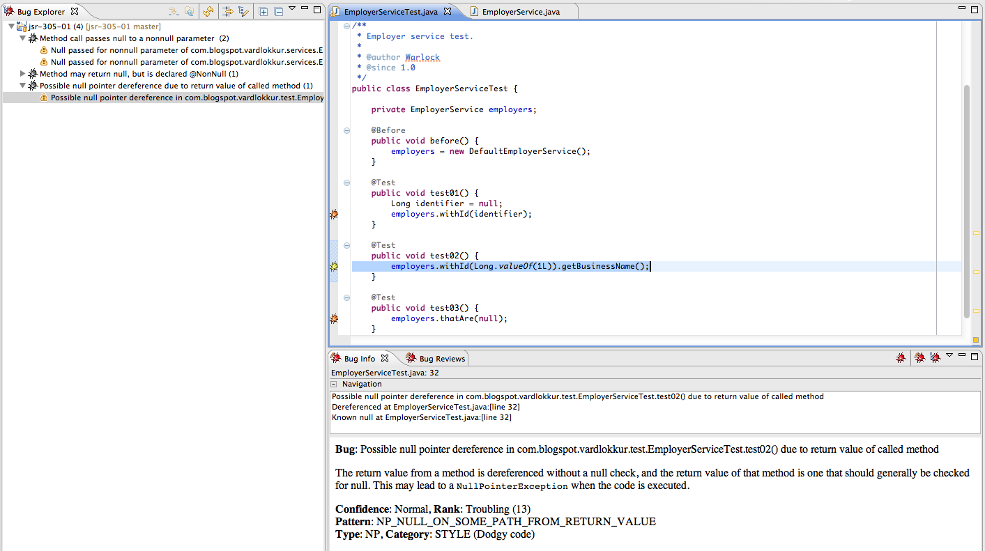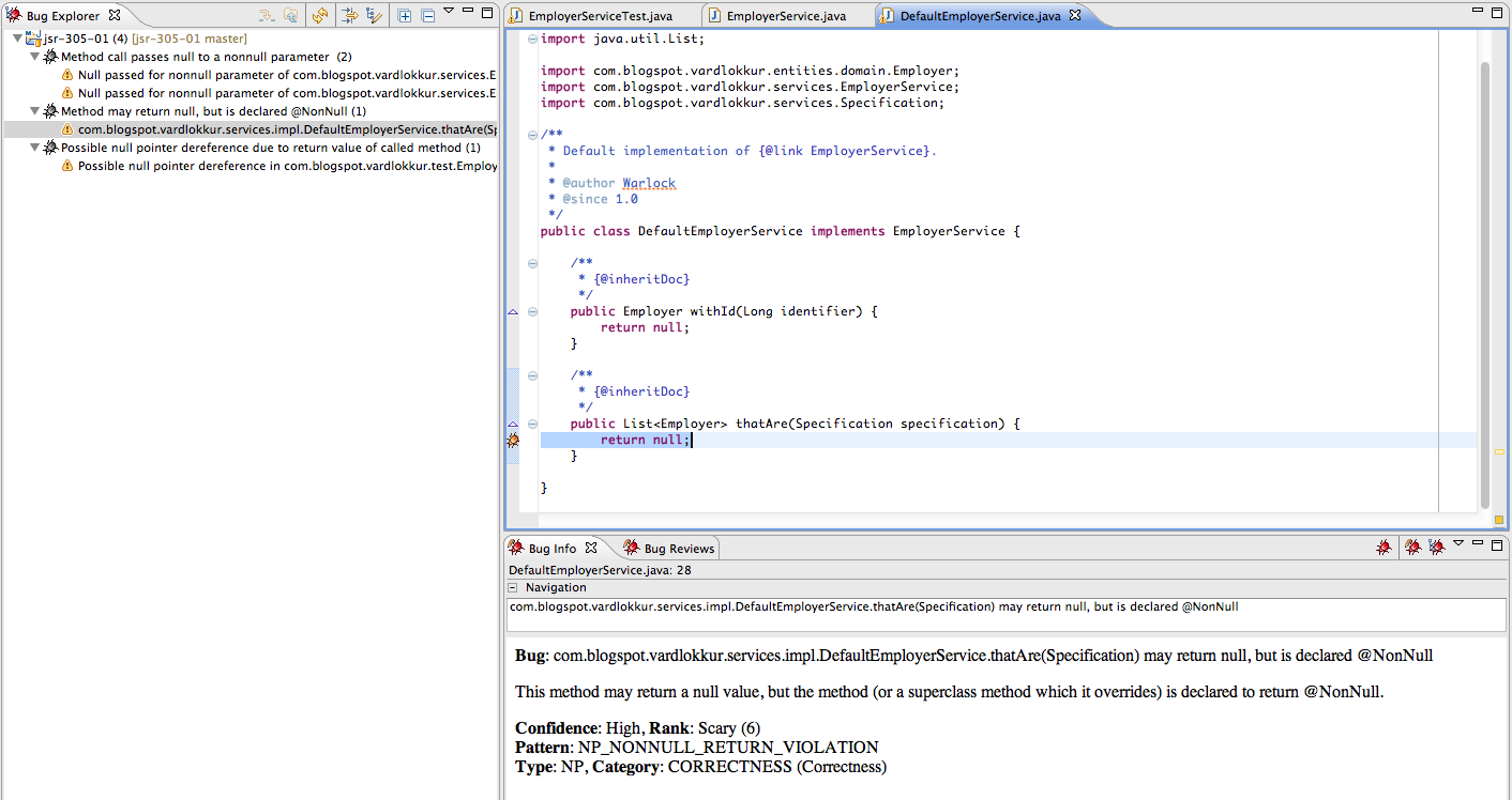 Аналогичным образом, ребята, пишущие служебный код, могут проверить свою работу в соответствии с определенными предположениями API, например если вы запустите FindBugs для самой ранней версии реализации сервиса: