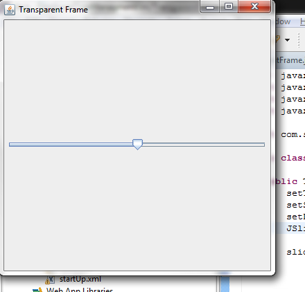 @Override public void stateChanged(ChangeEvent e) { JSlider slider = (JSlider) e.getSource(); if (!slider.getValueIsAdjusting()){ AWTUtilities.setWindowOpacity(TransparentFrame. this , slider.getValue()); } } |