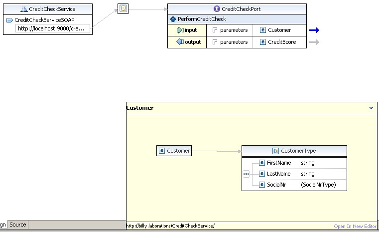 Как говорят в основном все SOA-архитекторы, вам всегда следует начинать с определения wsdl, создавая сервис сверху вниз. В этом примере нашей предполагаемой услугой будет очень простая служба проверки кредитоспособности, которая принимает клиента и предоставляет кредитную оценку и подробное описание причин, лежащих в основе оценки.